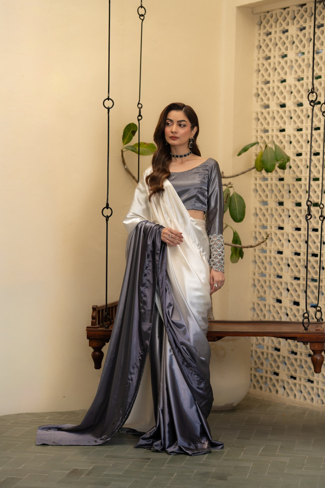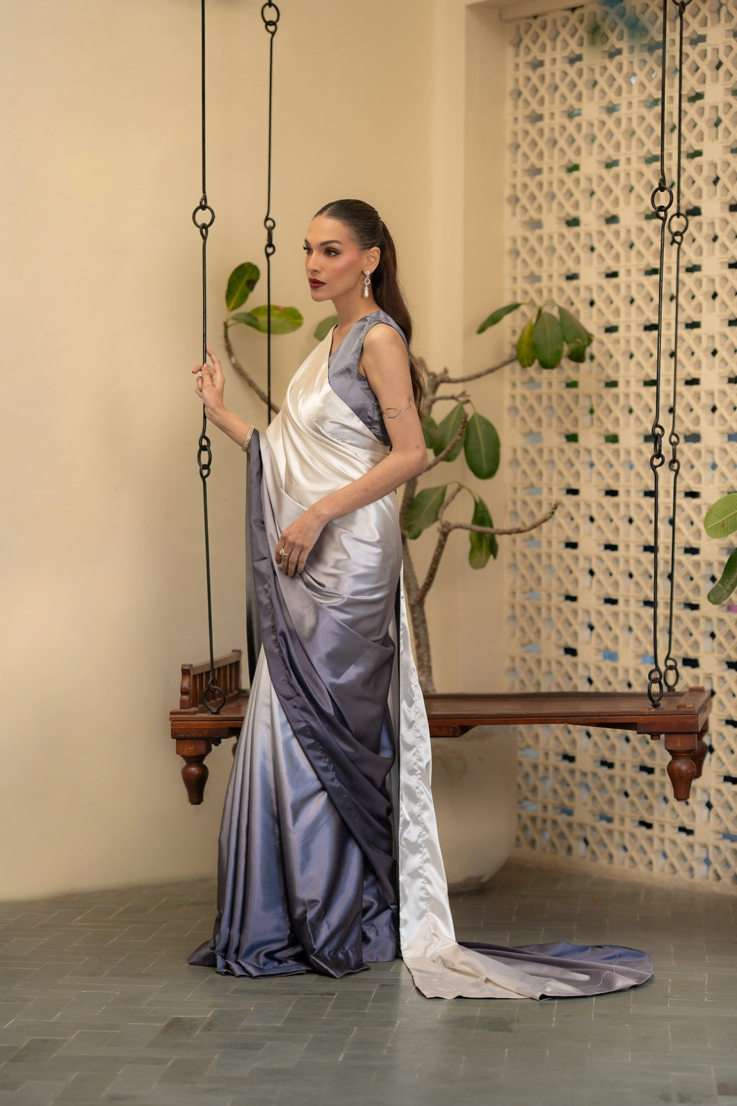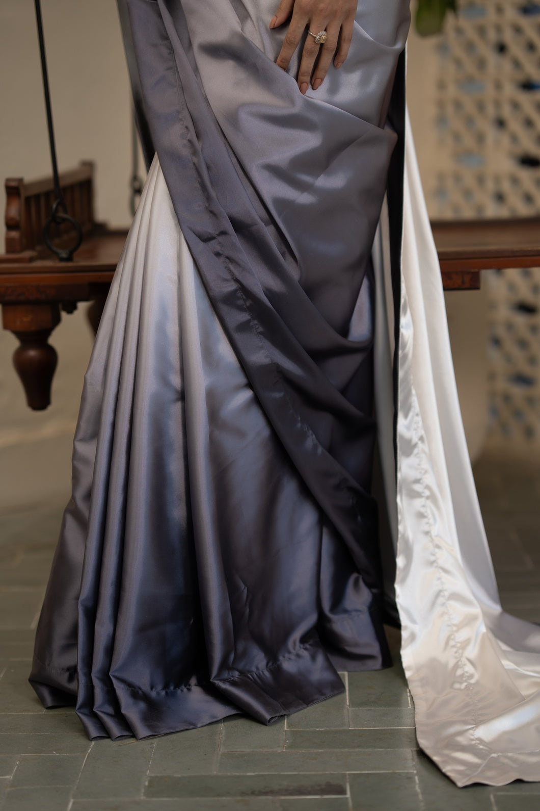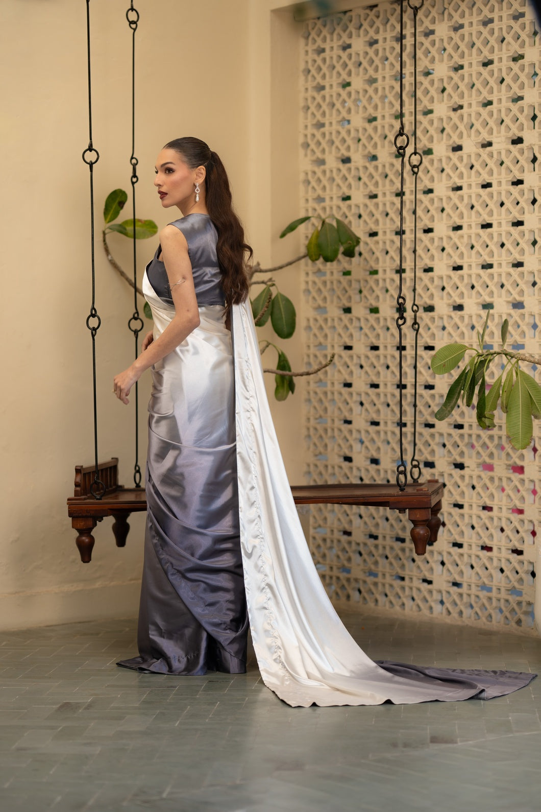 Crafted in a harmonious three-tone palette of charcoal grey, soft ash, and muted ivory with subtle sage undertones, this saree embodies contemporary refinement. The fluid drape is constructed in Imperial Silk Satin, celebrated for its luminous sheen and effortless fall.
