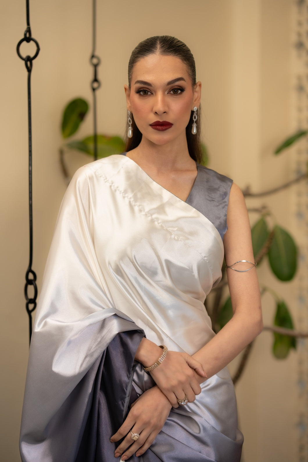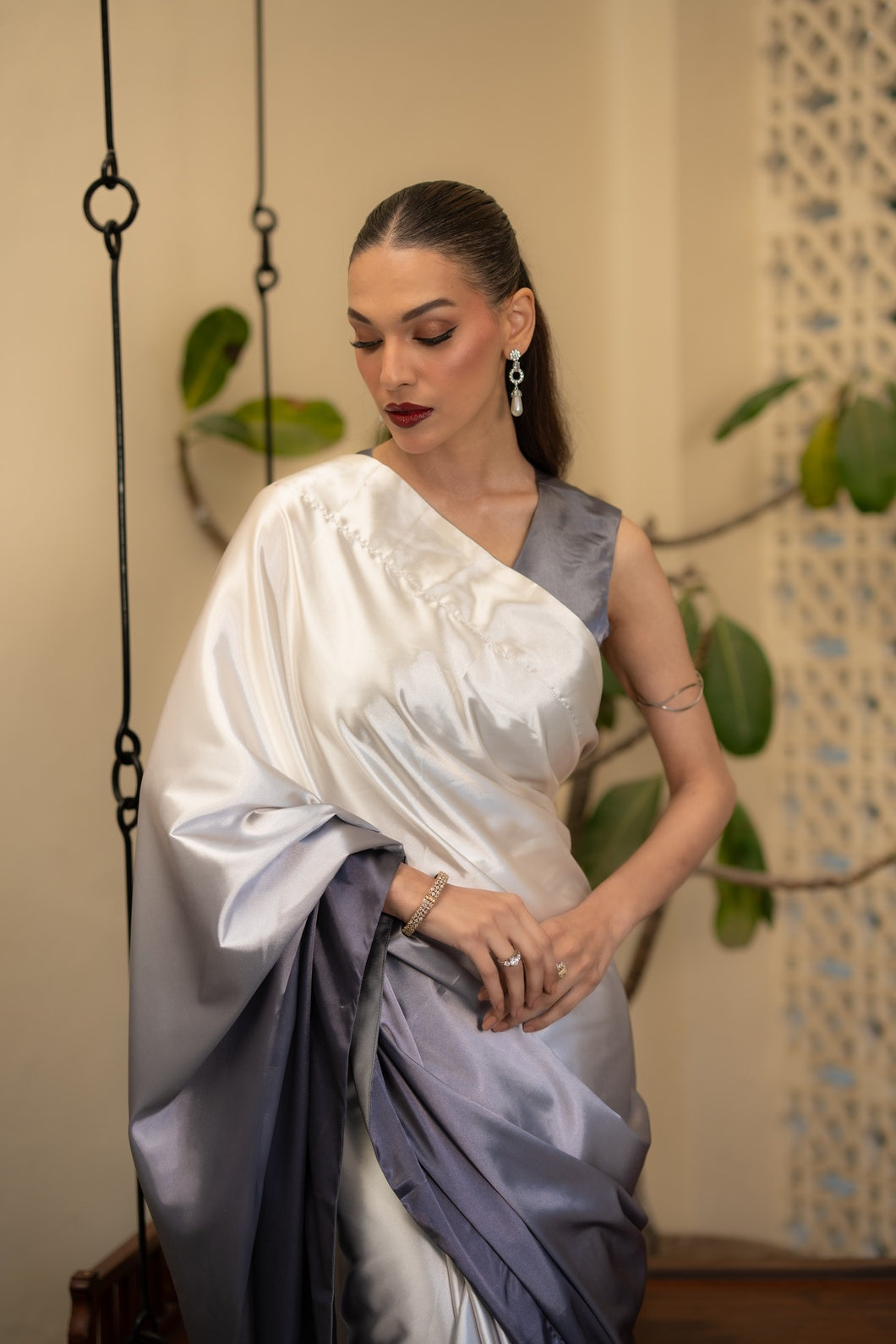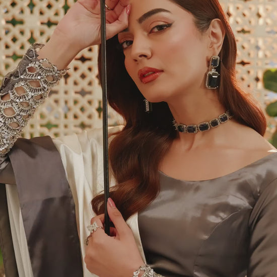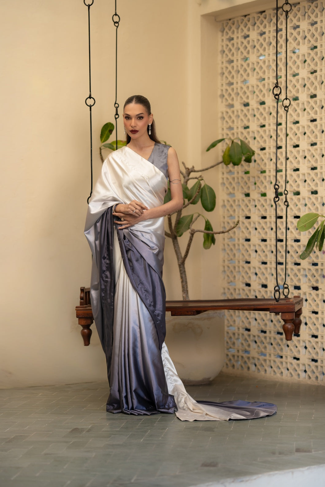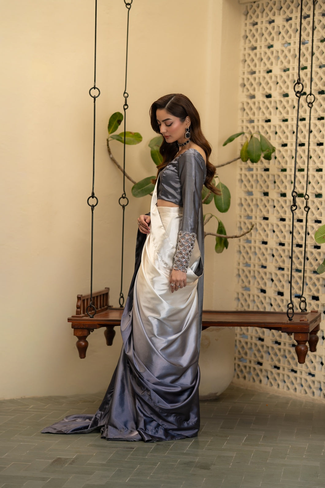 Crafted in a harmonious three-tone palette of charcoal grey, soft ash, and muted ivory with subtle sage undertones, this saree embodies contemporary refinement. The fluid drape is constructed in Imperial Silk Satin, celebrated for its luminous sheen and effortless fall.