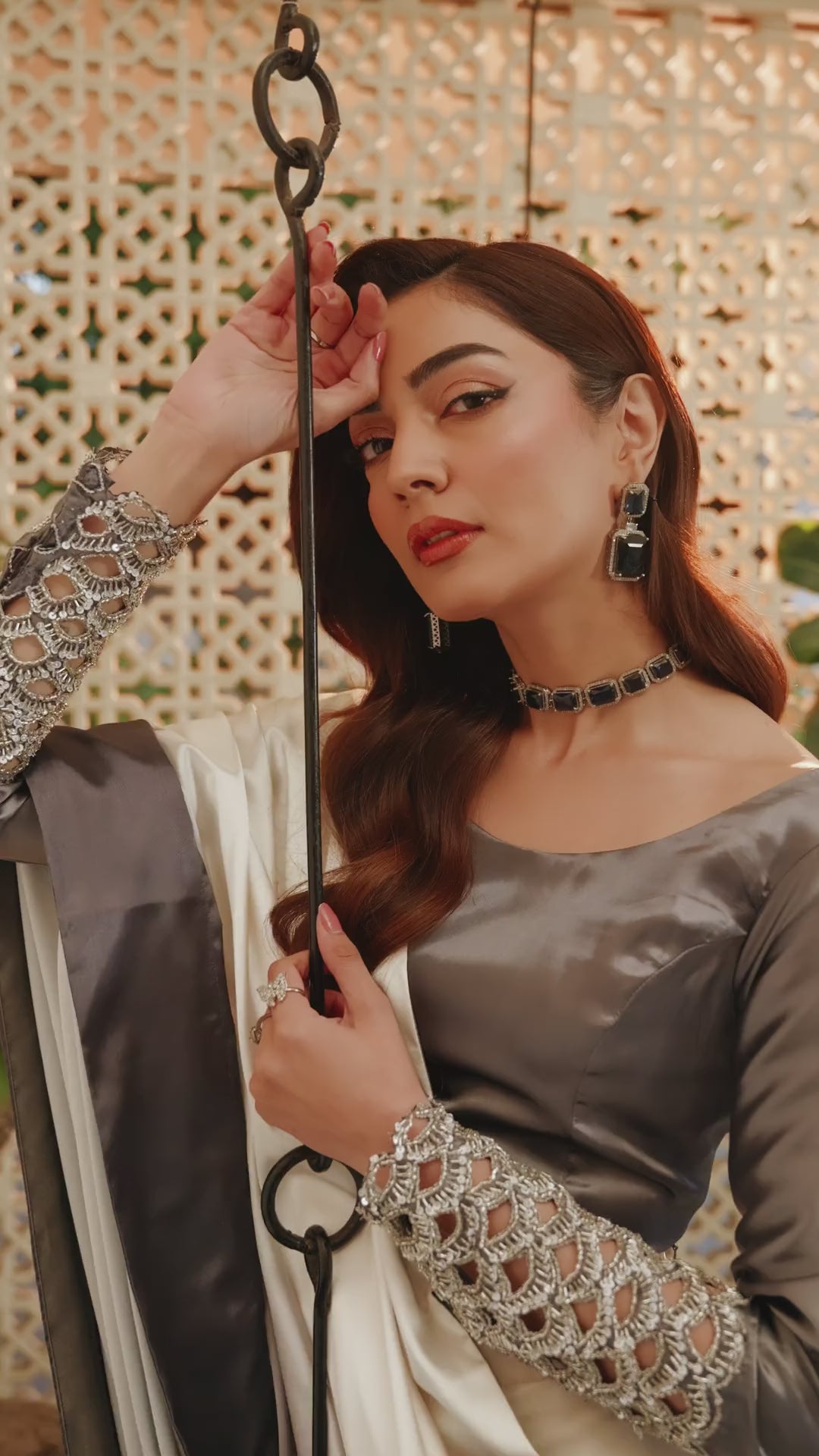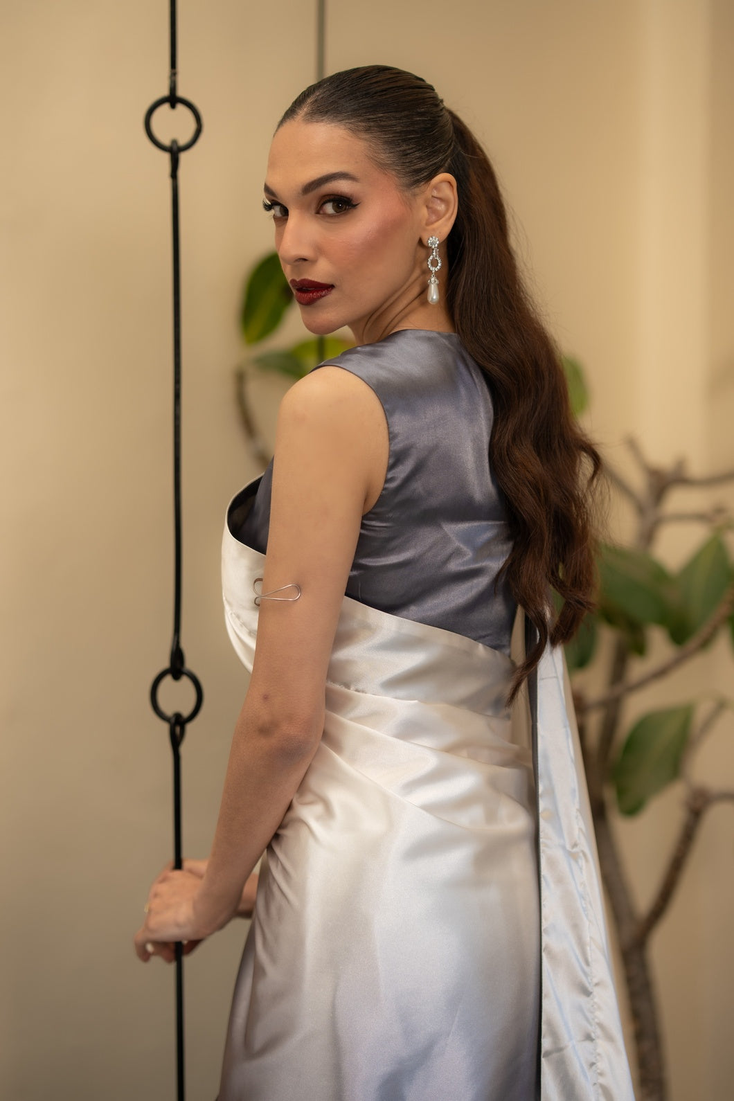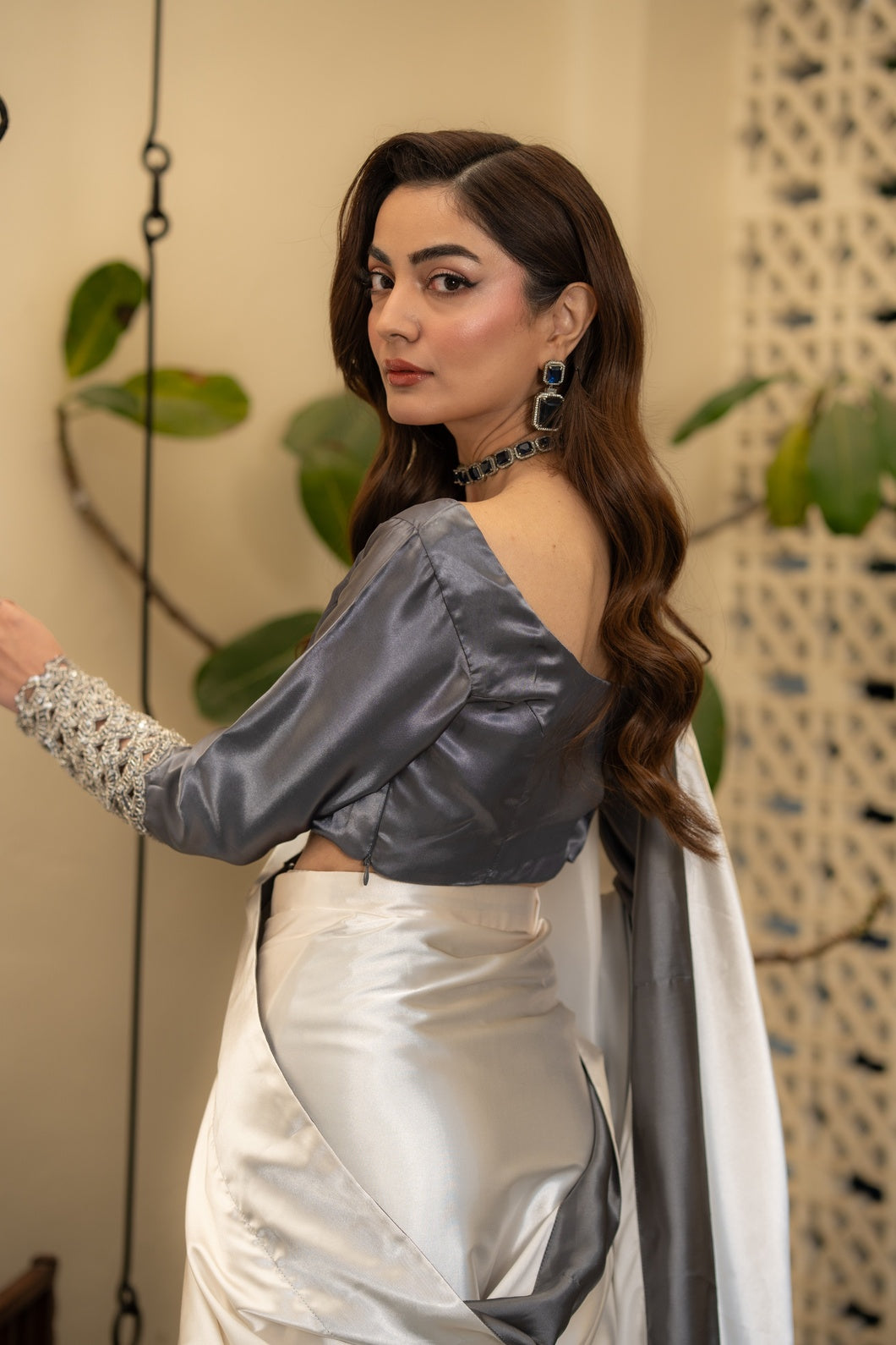 Paired with a deep charcoal blouse, the ensemble offers two distinct interpretations of elegance: