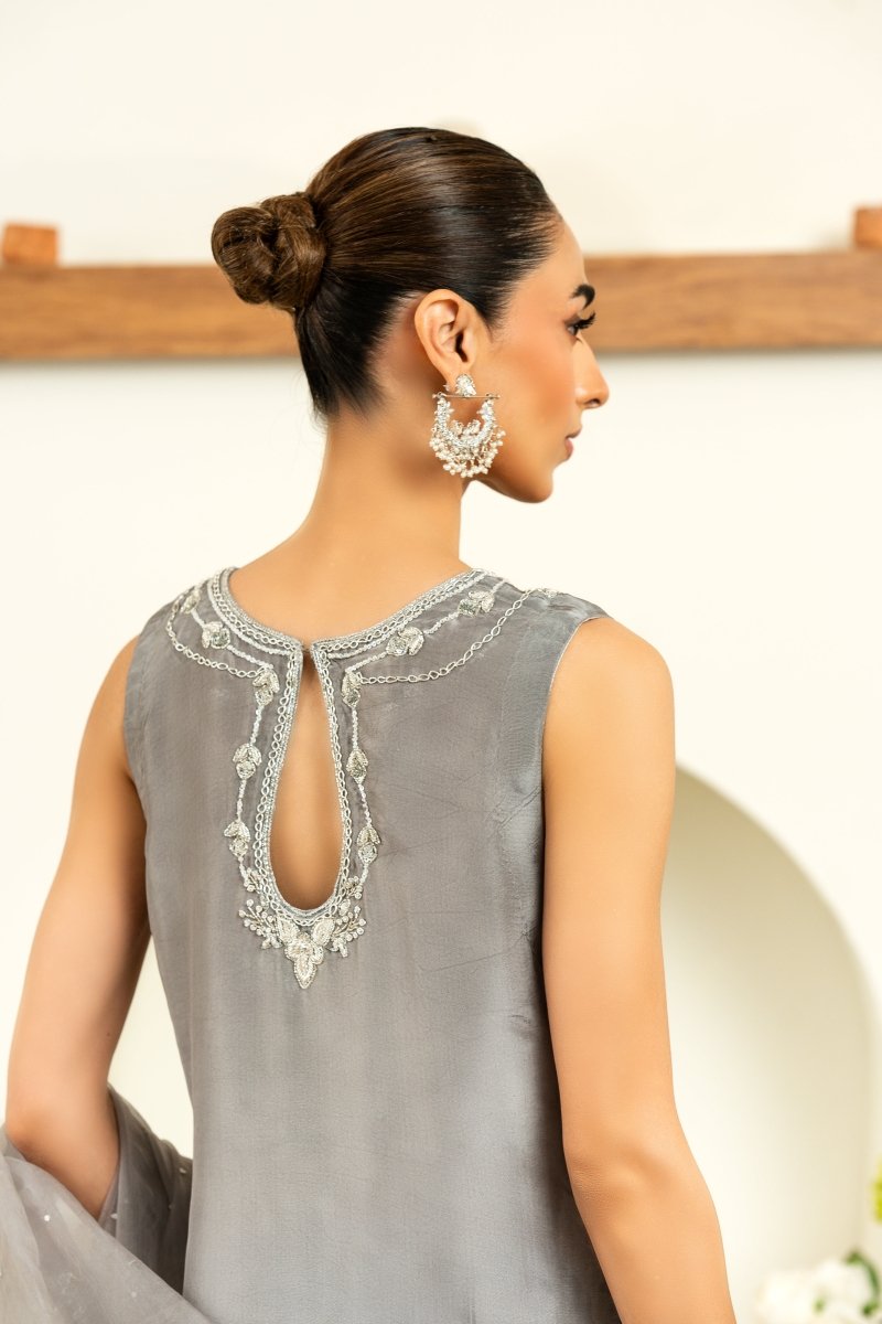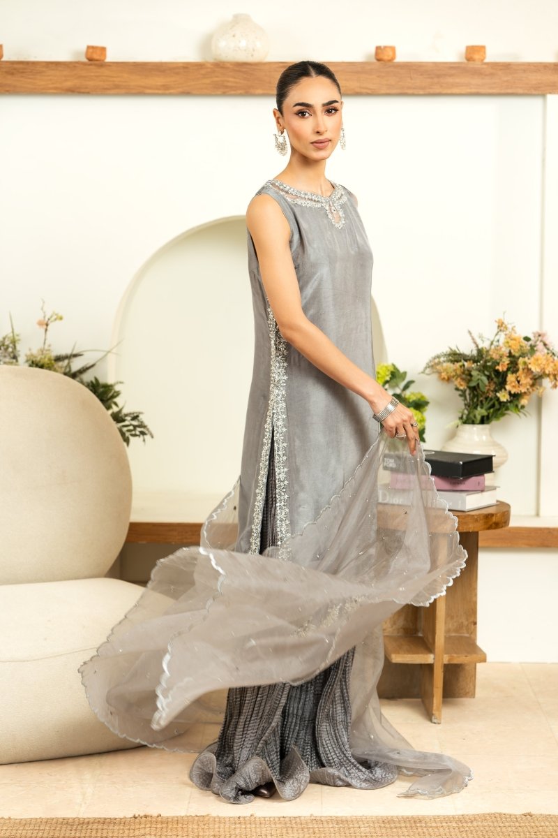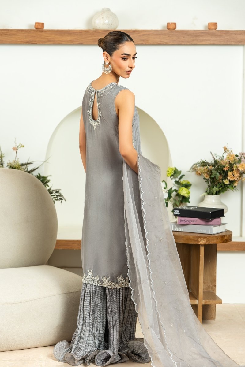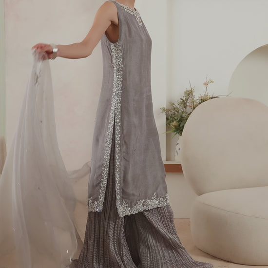 Drape yourself in understated luxury with GRISE, a formal masterpiece crafted from soft grey tussle silk. The round curved neckline is delicately hand-embellished with sequins, tilla, dhabka, and beadwork — a graceful interplay of shimmer and texture. The long, straight silhouette flows effortlessly over a crushed sharara, creating elegant movement and a flattering fall.