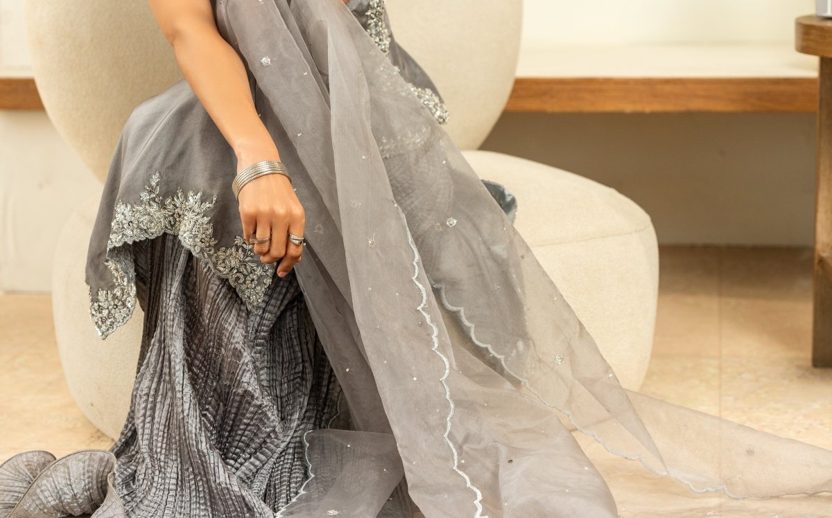 A pure organza dupatta, feather-soft in texture and delicately adorned with a glimmering spray of sequins and stones, is finished with finely detailed borders — adding depth, softness, and a whisper of ethereal charm. GRISE embodies quiet sophistication for the modern woman who shines without shouting.