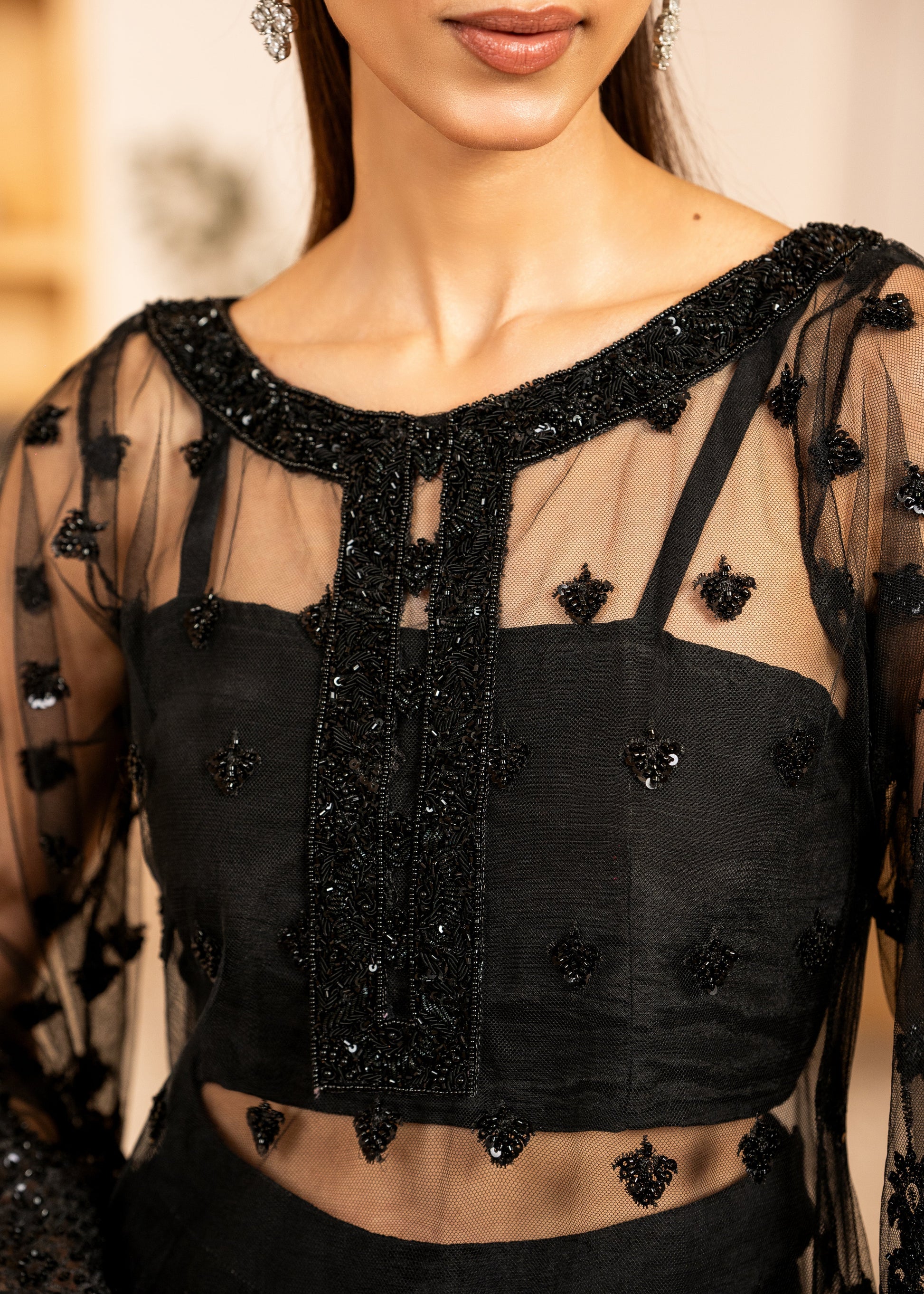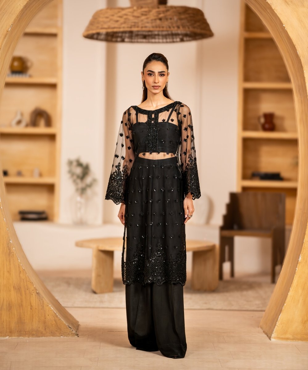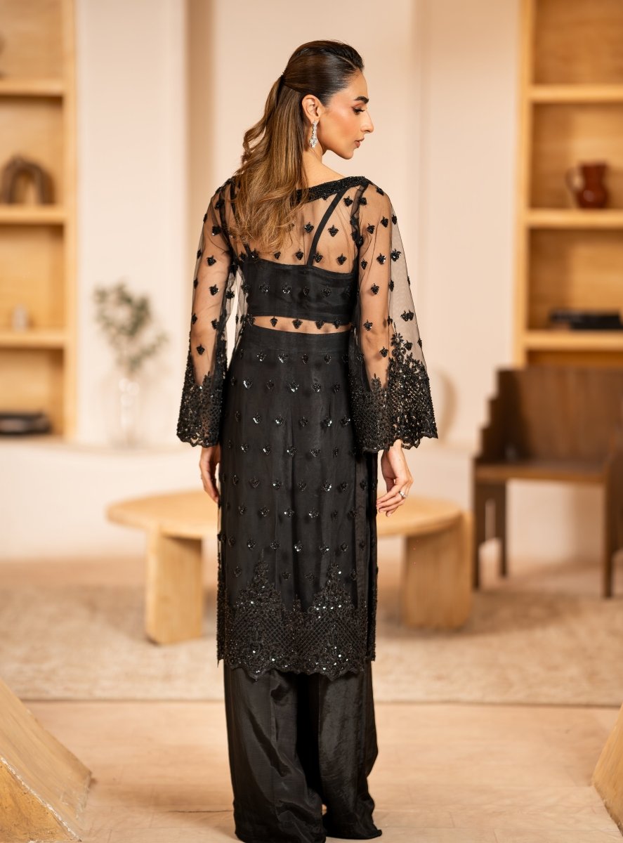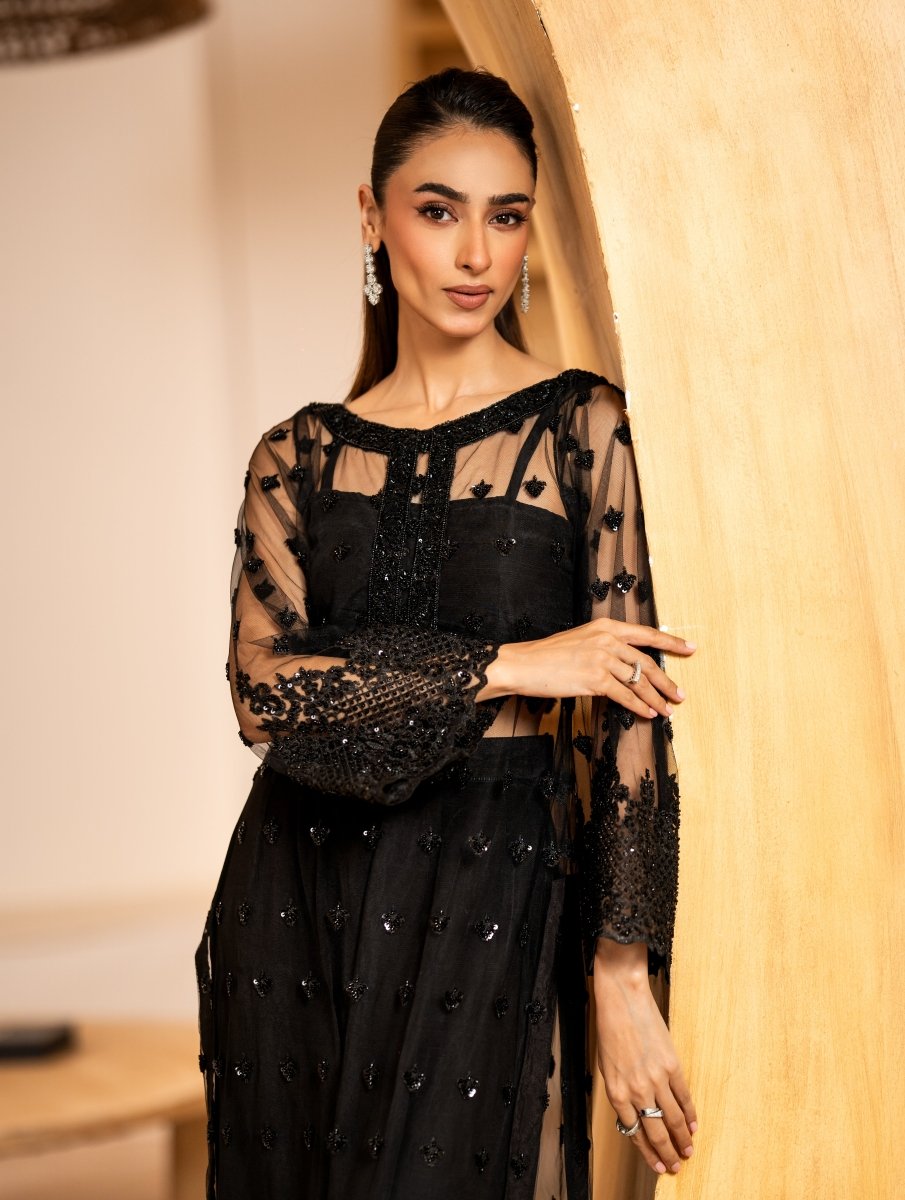 black net, it features exquisite hand embellishments of sequins, cutdana, and fine tilla — each detail shimmering with