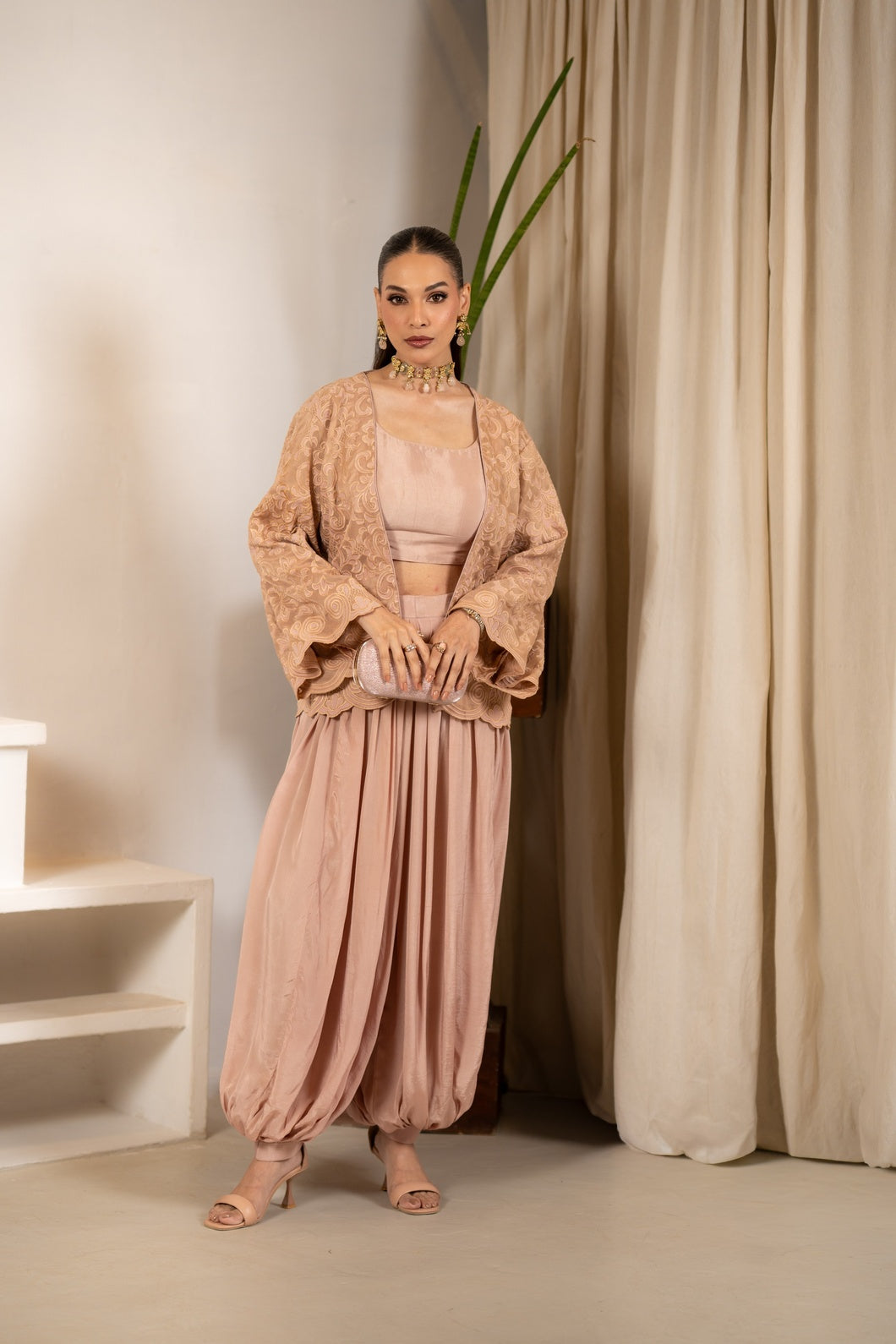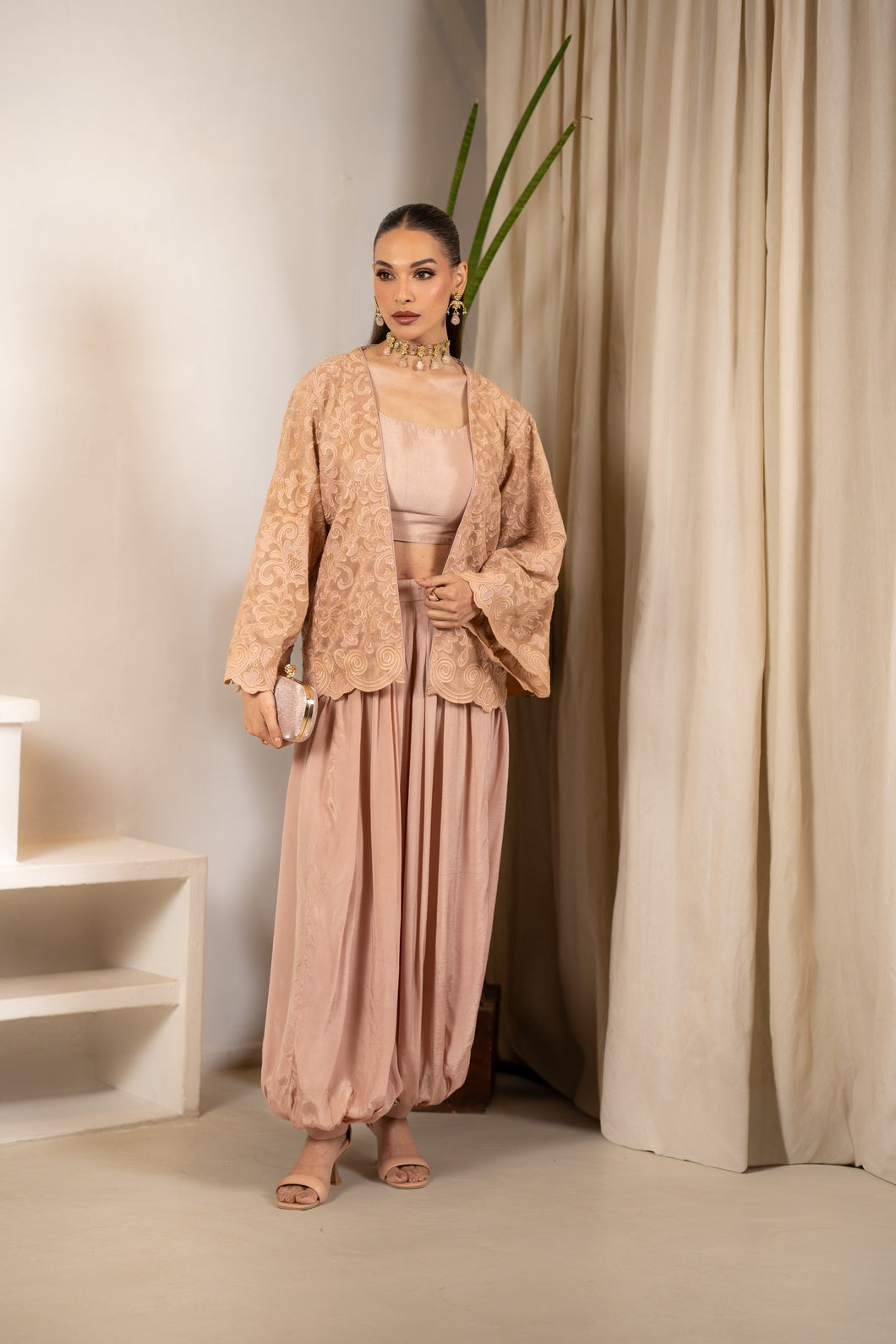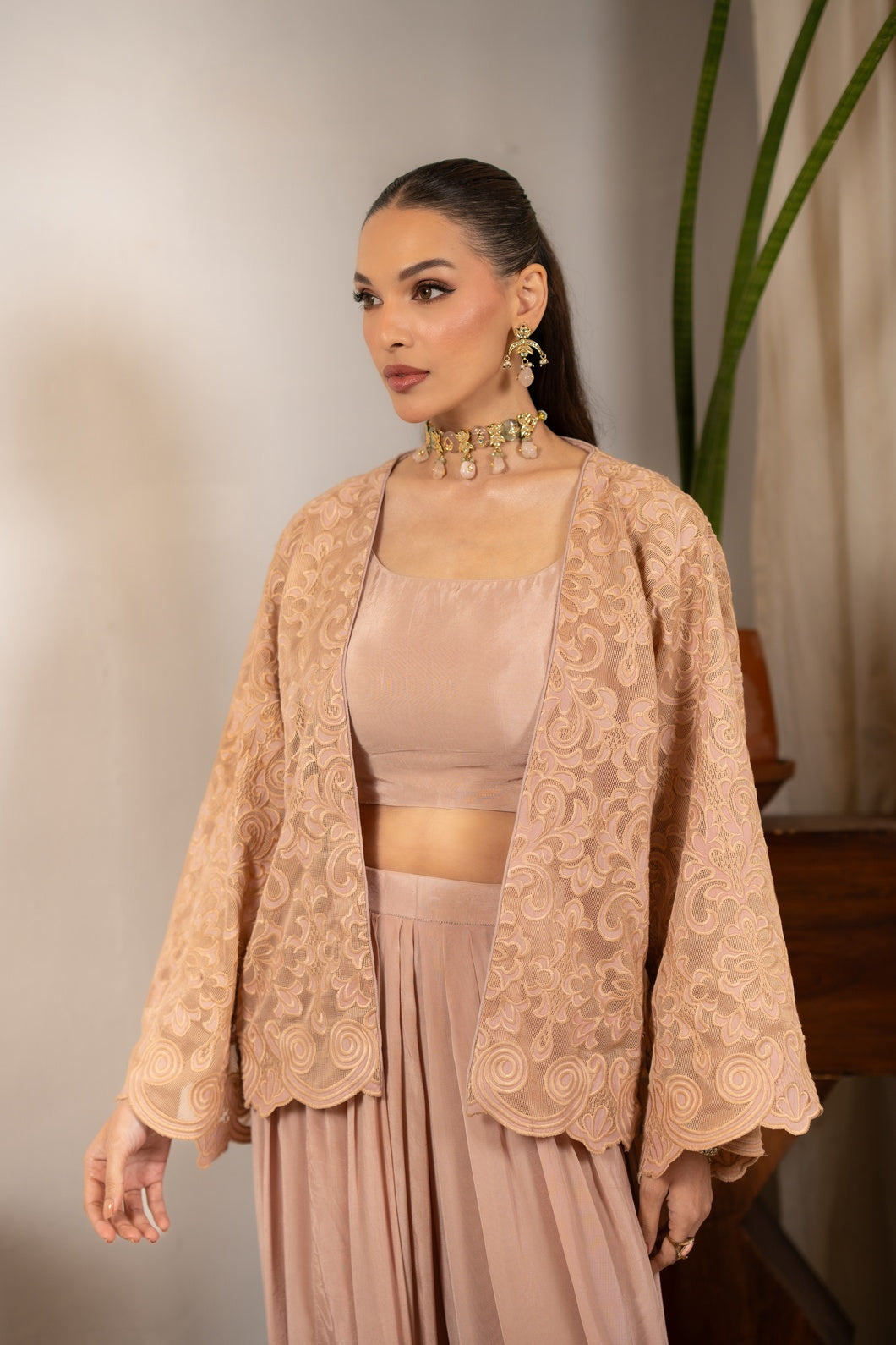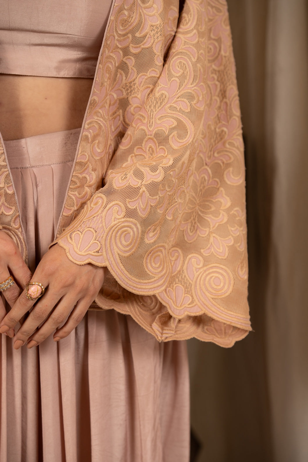 Layered with a delicately embroidered jacket crafted in Couture French Net, the ensemble is elevated through intricate threadwork and airy detailing. The cropped silhouette adds architectural definition, while flared bell sleeves introduce fluid movement and elegance.