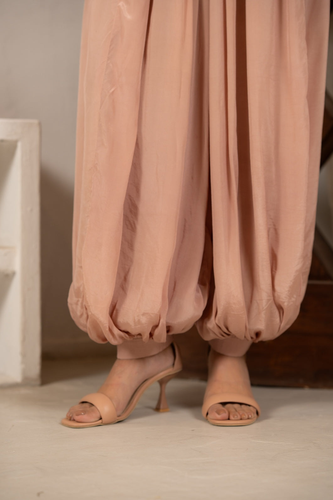 Designed in a delicate blush tone, Vellé merges structure and softness in perfect harmony. The blouse and barrel-leg trousers are tailored in Lustrous Italian Silk Blend, selected for its refined sheen and graceful drape.
